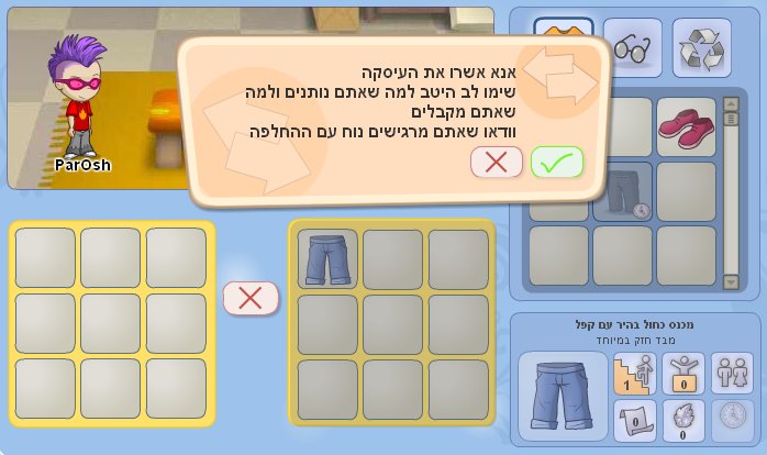א. מעל לכל, זכרו – אין אפשרות לגנוב מכם פריט, אם אתם לא מאפשרים זאת! אם לא תאשרו את ההחלפות, לא ניתן לאשר אותן במקומכם. אם לא תזרקו פריט, לא ניתן לזרוק אותו במקומכם! יש לכם שליטה מלאה על הפריטים שלכם, ואתם יכולים למנוע את כל מקרי הגניבות מכם. זה לגמרי בידיים שלכם